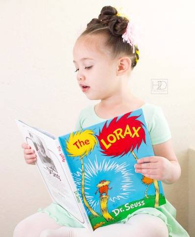 Many children wear Dr. Seuss-inspired outfits on March 2. Sarah, who runs @hairtodream on Instagram, created a Truffula Tree Hairstyle Tutorial. Truffula trees are featured in The Lorax, a children's book written by Dr. Seuss that warns about humanity's impact on environmental degradation. In the video, you may notice that her daughter wore a short sleeve leotard in mint paired with a dance skirt in mint from the Leotard Boutique as part of her special outfit.